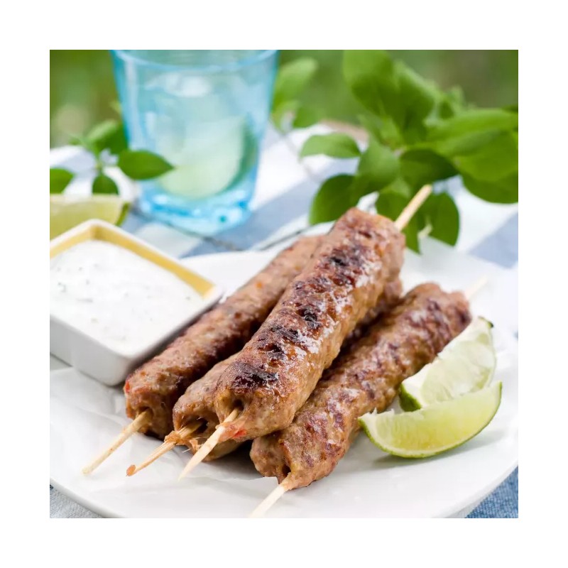 Paquet de 4 brochettes façon Kefta de boeuf haché. Idéal pour les enfants. A faire à la plancha ou au barbecue. Poids unitaire par brochette 110g