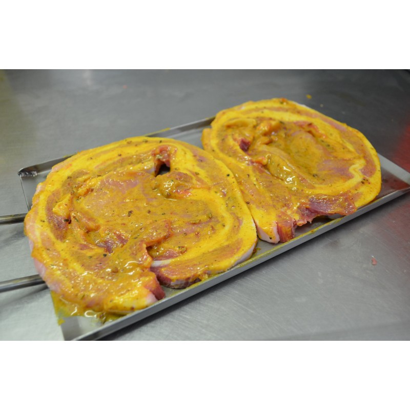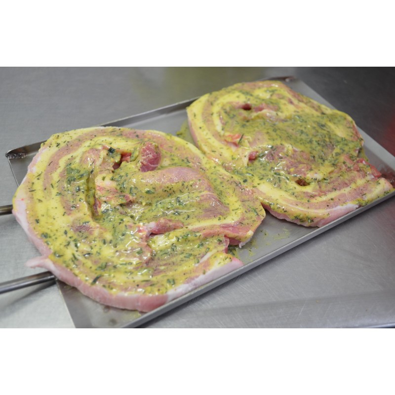 Sachet de 2 tranches de Breizh bacon. Morceau de filet avec le lard. (A braiser ou poêler). Inspiré de l'English Bacon mangé au petit déjeuner en Angleterre... à la sauce Bretonne Poids du sachet : 0.4Kg. Poids par tranche : 200g